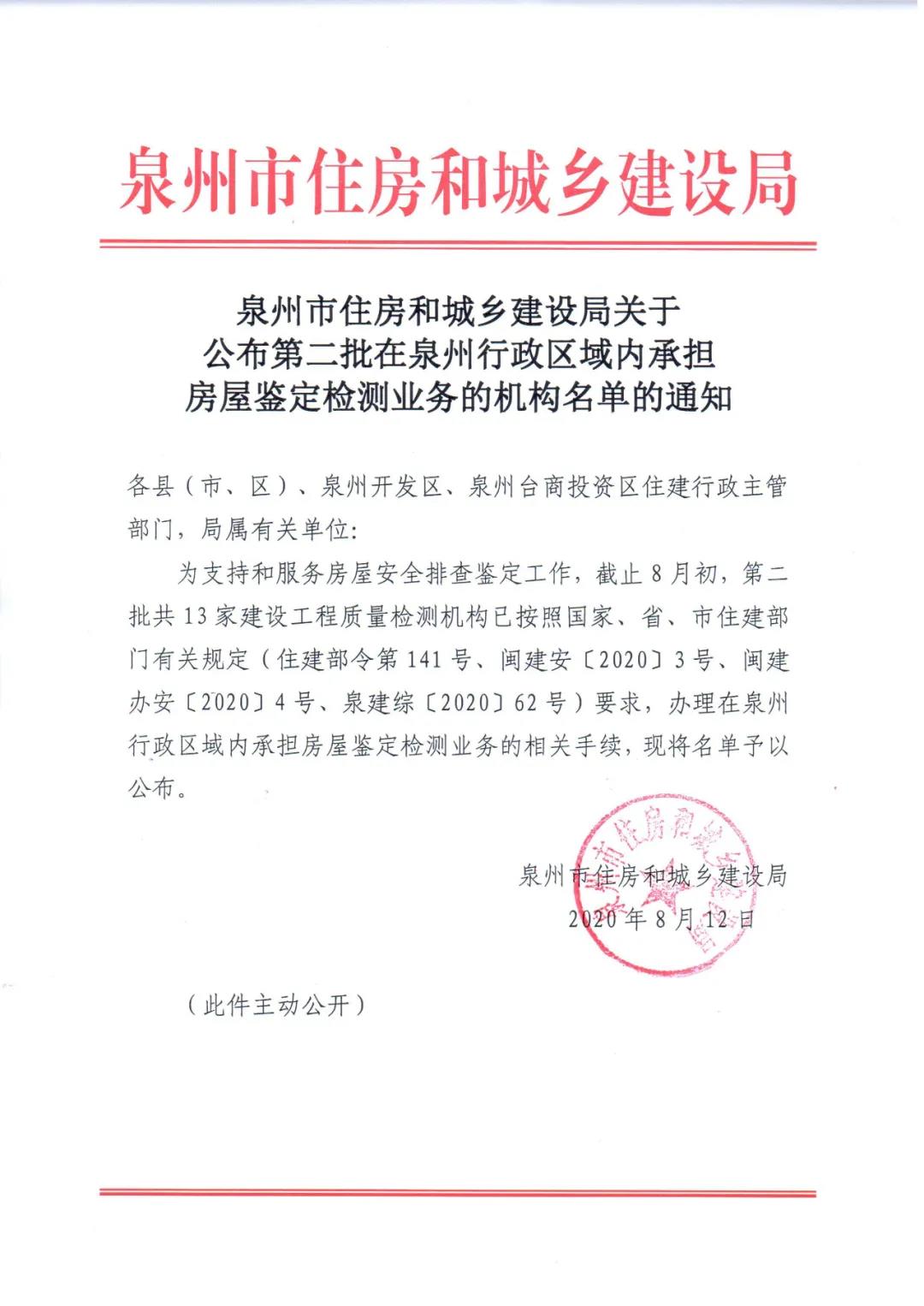 繼我司順利在福建省房屋結(jié)構(gòu)安全隱患大排查大整治百日攻堅(jiān)專項(xiàng)行動(dòng)中順利通過(guò)福建省住建廳的備案工作后,按照有關(guān)規(guī)定的要求,我司繼續(xù)申請(qǐng)辦理在泉州行政區(qū)域內(nèi)承擔(dān)房屋鑒定檢測(cè)業(yè)務(wù)的相關(guān)手續(xù),現(xiàn)已取得泉州市房屋安全鑒定檢測(cè)業(yè)務(wù)資質(zhì),可在泉州市開(kāi)展房屋安全鑒定檢測(cè)工作。